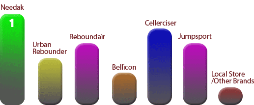 Am anderen Ende der Skala ist der deutsche Hersteller Bellicon, der einen nicht faltenden Bungee-String Rebounder für satte 700 $ anbietet. Als nächstes kommt der JumpSport mit einer Vielzahl unterschiedlicher Modelle. Ihr Spitzenmodell ist das einzige, das in Bezug auf Mattengröße und -qualität den anderen sehr nahe kommt und im Einklang mit den anderen seilbetriebenen Reboundern bei $ 620 liegt. Im mittleren Bereich haben Sie Needak, ReboundAIR und Cellerciser, wobei ReboundAIR rund 50 Dollar günstiger ist als die beiden anderen. Auf der Grundlage unserer Marktanteilsschätzungen entscheiden sich die meisten Kunden, die einen billigen Rebounder bevorzugen, für den Urban Rebounder oder das billigere Modell von JumpSport, und der Rest für ein Needak.